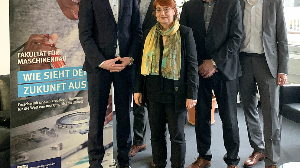 Photo (Paderborn University, Ann-Kathrin Böker): (from left to right) Thilo C. Pahl, Prof. Dr Alexander Schlüter, University President Prof. Dr Birgitt Riegraf, Dean Prof. Dr Mirko Schaper and Prof. Dr René Fahr, Vice President for Knowledge and Technology Transfer at Paderborn University.