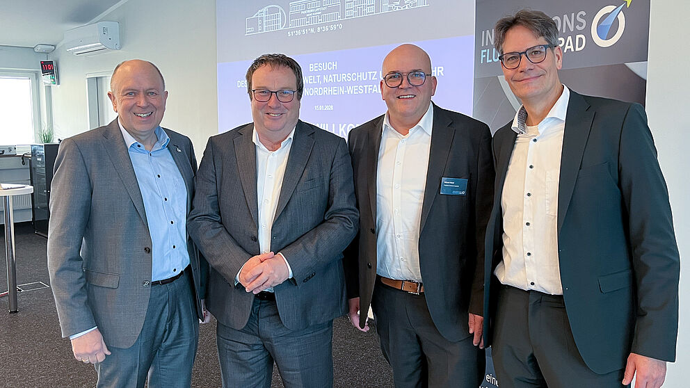 Photo (Innovation Airport PAD): During the visit to Paderborn/Lippstadt Airport (from left): District Administrator Christoph Rüther, NRW Transport Minister Oliver Krischer, Airport Managing Director Roland Hüser and Prof. Dr. René Fahr, Vice-President for Transfer and Sustainability at Paderborn University.