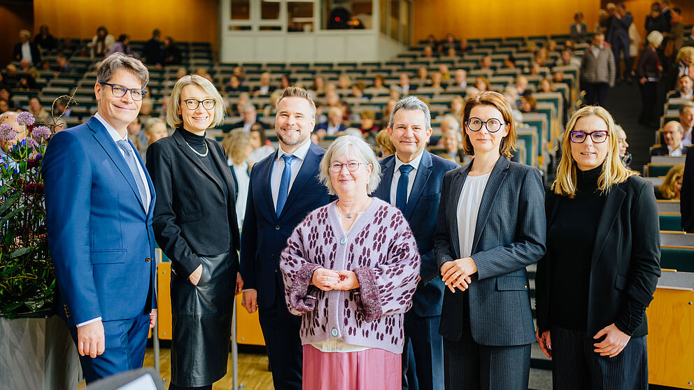 Photo (Paderborn University, Besim Mazhiqi): Keynote speaker Prof Dr Michaela Vogt (2nd from left) and the Executive Board of Paderborn University (from left): Prof Dr René Fahr, Vice President for Transfer and Sustainability, Prof Dr Matthias Bauer, Simone Probst, Vice President for Business and Human Resources Management, Prof Dr Thomas Tröster, Prof Dr Beate Flath, Vice President for Teaching, Studies and Quality Management and Prof Dr Heike Trautmann, Vice President for International Relations.