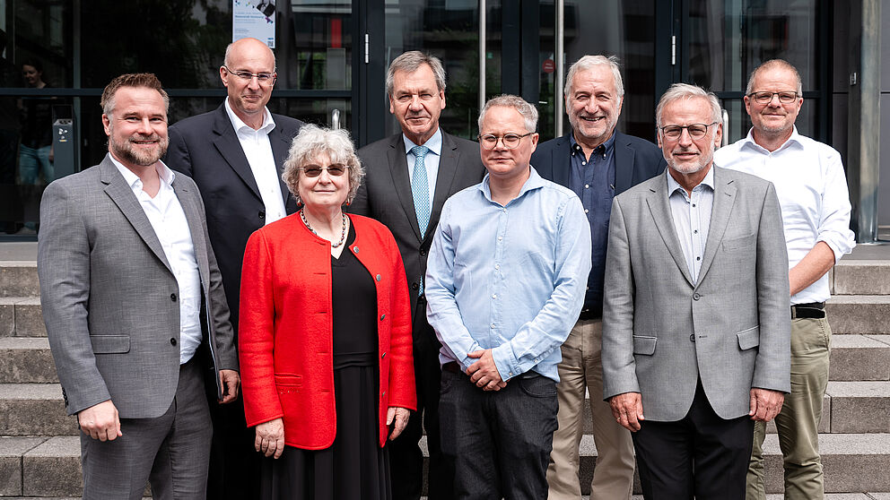 Photo (Paderborn University, Thorsten Hennig): (from left) Prof. Dr Matthias Bauer, Prof. Dr Jürgen Klüners. Prof. Dr Ingrid Daubechies, Prof. Dr Jürg Kramer, Chairman of the German Mathematical Society, Prof. Dr Martin Kolb, Dr. Michael Laska, former initiator of the Weierstrass Lecture, Prof. Dr Volker Peckhaus and Dr Markus Holt, Managing Director of the Faculty of Computer Science, Electrical Engineering and Mathematics.