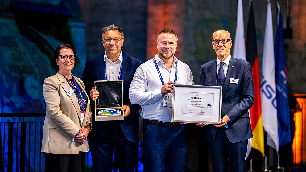 Photo (adh/Jan Patrick Wagner): (from left) Dr Verena Buck, Ulrich Kussin, Prof Dr Matthias Bauer and Leonz Eder at the award ceremony for the label at the FISU World Conference.