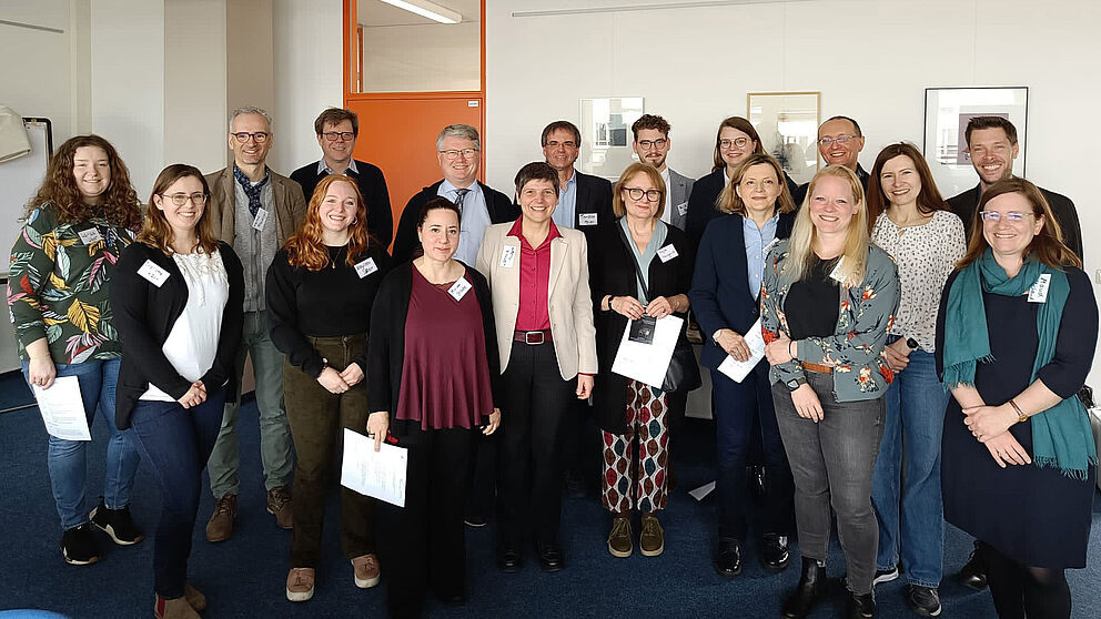 Foto (Universität Paderborn, Tanja Dittmann): Prof. Dr. Birgitt Riegraf, Präsidentin der Universität Paderborn (vorne Mitte), und Simone Probst, Vizepräsidentin für Wirtschafts- und Personalverwaltung (vorne links), begrüßten gemeinsam mit dem Team der Perso-nalentwicklung die neuen Mitarbeiter*innen.