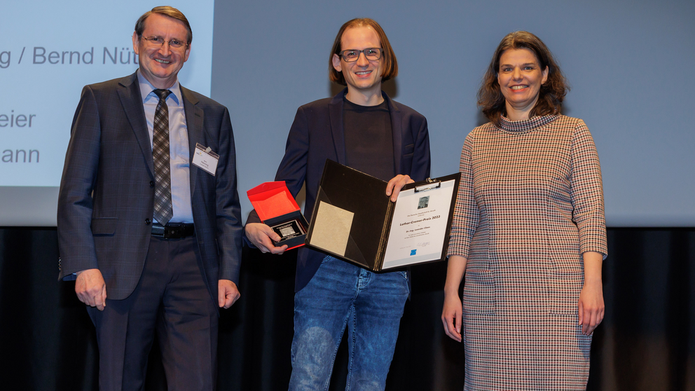 Foto (Gilbert Studios): (v. l.) Prof. Dr.-Ing. Bernd Henning (Universität Paderborn/Laudator), Dr.-Ing. Leander Claes (Preisträger) und Prof. Dr.-Ing. Sabine C. Langer (Präsidentin der DEGA) bei der Preisverleihung in Hamburg.