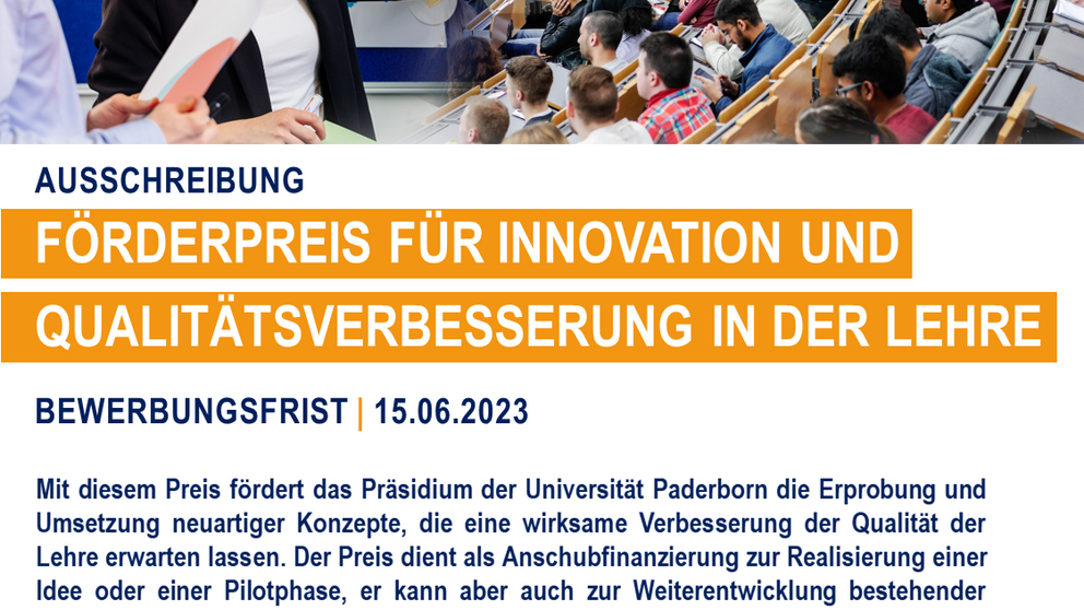 Alle Lehrenden der Universität Paderborn werden ermutigt, sich an der Ausschreibung des "Lehrpreises für wissenschaftlichen Nachwuchs" oder des "Förderpreises für Innovation und Qualitätsverbesserung in der Lehre" zu beteiligen.