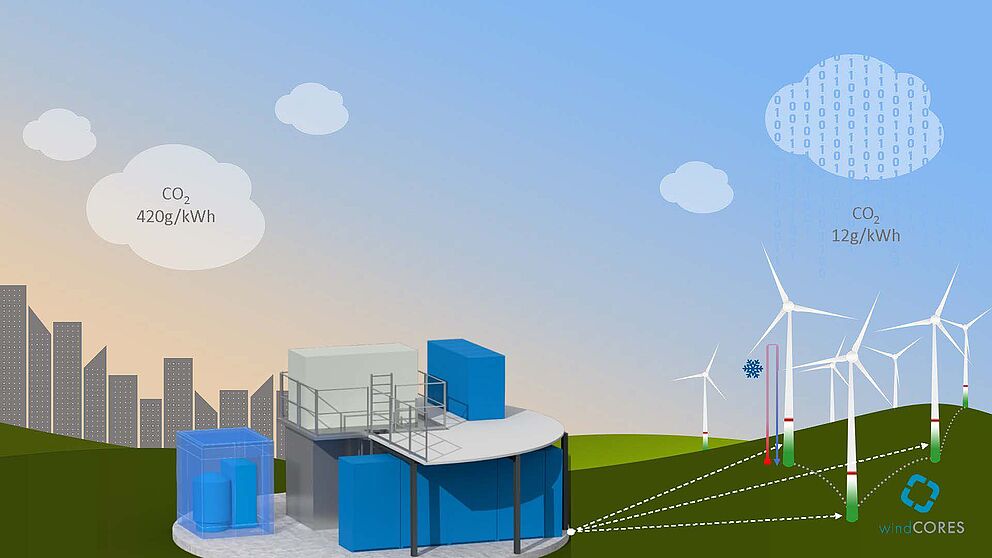 Graphic (University of Paderborn): Wind turbines that house data centres in their towers should supply them with the wind power generated on site and take into account the waste heat generated as a limiting factor.