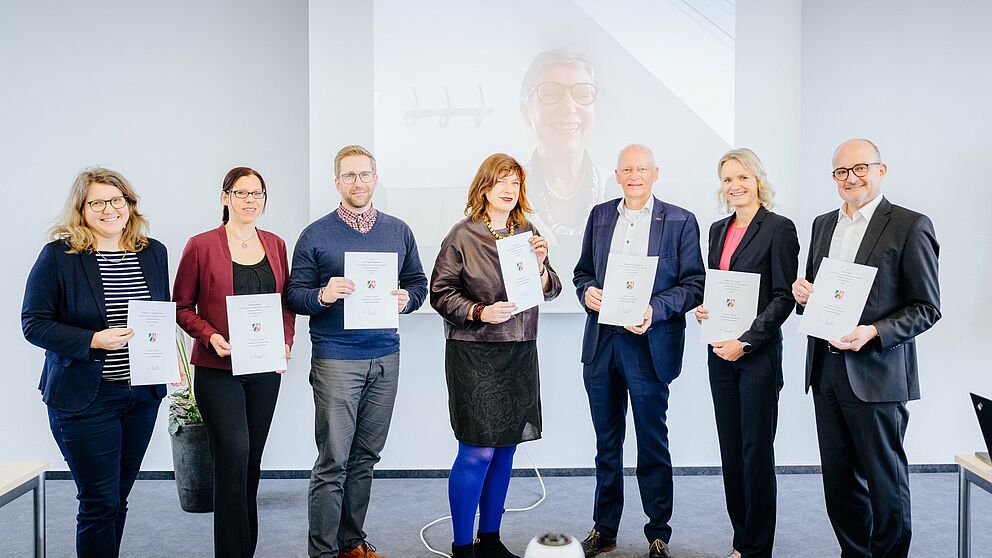 Foto (Universität Paderborn, Besim Mazhiqi): In der konstituierenden Sitzung wurden die Mitglieder des Hochschulrats mit der Übergabe der Urkunden durch das Ministerium für Wissenschaft und Kultur NRW in den Hochschulrat bestellt. (v. l.) Prof. Dr. Christine Silberhorn, Dr. Doreen Hartmann, Dr.-Ing. Steffen Jesinghausen, Dr. Dagmar Simon (Vorsitzende), Prof. Dr. Rita Burrichter, Prof. Dr. Jürgen Brautmeier, Prof. Dr. Urška Kosi und Andreas Speith. (Nicht im Bild: Prof. Dr. Holger Karl)