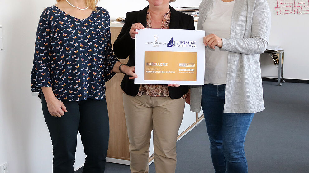 Foto (Heiko Appelbaum): Freuen sich über die wiederholte Auszeichnung (v. l.): Diana Riedel, Sachgebietsleiterin Bereich Arbeits-, Gesundheits- und Umweltschutz, Simone Probst, Vizepräsidentin für Wirtschafts- und Personalverwaltung, und Sandra Bischof, Leiterin der Gesunden Hochschule.