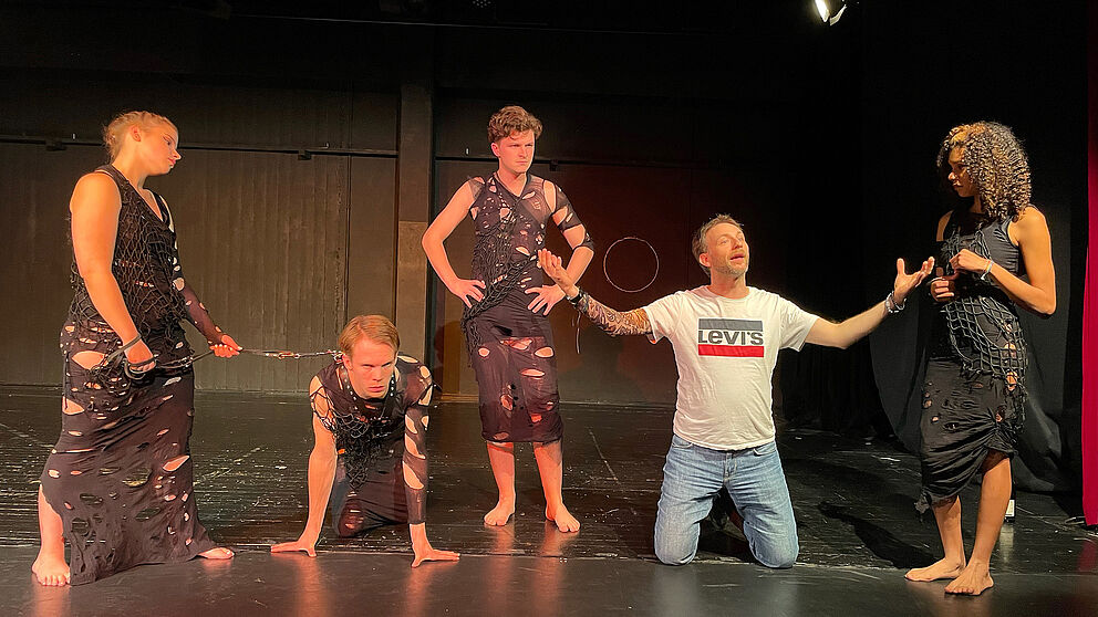 Foto (Universität Paderborn, Sascha Löschner): (V. l. n. r.): Die Darsteller*innen Viviane Gladow, Jonas Fromme, Robin Katona, Ronny Winter und Mela Marie Vollmer.