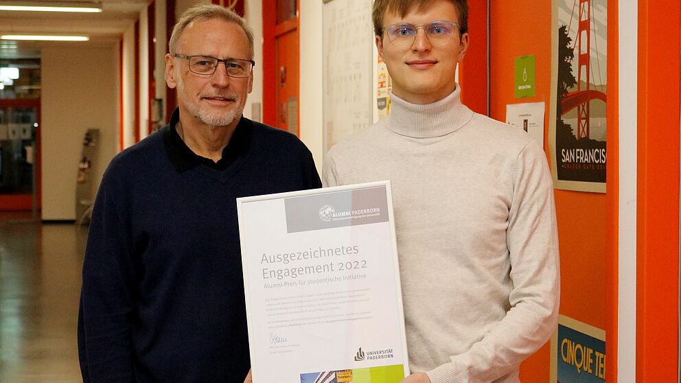 Foto: (Universität Paderborn, Alexandra Dickhoff): Seit 2016 organisiert die studentische Initiative „Pegasus“ Veranstaltungen und Workshops zu Fragestellungen aus den Bereichen Philosophie, Kultur und Gesellschaft. Dafür erhält die Gruppe den Alumni-Preis für „Ausgezeichnetes Engagement 2022“: (v. l.) Prof. Dr. Volker Peckhaus, Alumni Paderborn-Vorsitzender, überreicht die Auszeichnung an den Pegasus-Vorsitzenden Gabriel Spieker.