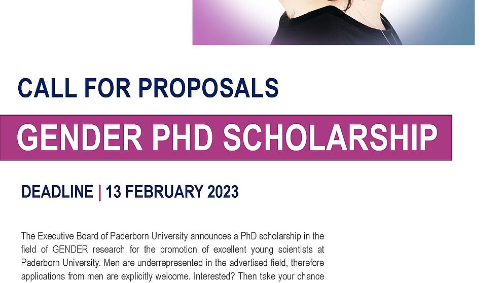 The Executive Board of Paderborn University announces a three year PhD scholarship in the field of Gender research for the promotion of excellent young scientists at Paderborn University.