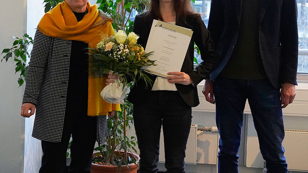 Foto (Universität Paderborn, Tanja Dittmann): Prof. Dr. Birgitt Riegraf (links) und Prof. Dr. Johannes Blömer gratulieren Dr. Iuliia Myroshnychenko zu ihrem Stipendium.