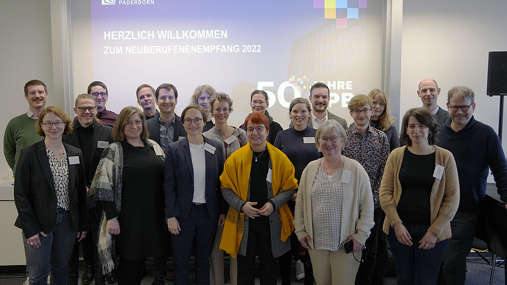 Foto (Universität Paderborn, Tanja Dittmann): Die neuberufenen Professor*innen mit Universitätspräsidentin Prof. Dr. Birgitt Riegraf (vorne, 3.v.r.) und der Vizepräsidentin für Wirtschafts- und Personalverwaltung Simone Probst (vorne, 2.v.r). Aus terminlichen Gründen oder krankheitsbedingt konnten nicht alle Neuberufenen teilnehmen.