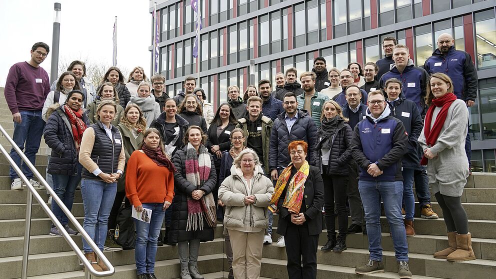 Foto (Universität Paderborn, Tanja Dittmann): Prof. Dr. Birgitt Riegraf, Präsidentin der Universität Paderborn (vorne rechts), und Simone Probst, Vizepräsidentin für Wirtschafts- und Personalverwaltung (vorne links), begrüßten gemeinsam mit dem Team der Personalentwicklung die neuen Mitarbeiter*innen.