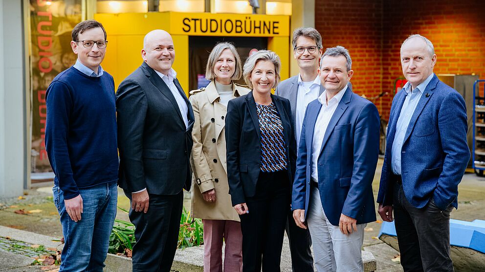 Foto (Universität Paderborn, Sascha Löschner): (V. l. n. r.): Die Darsteller*innen Viviane Gladow, Jonas Fromme, Robin Katona, Ronny Winter und Mela Marie Vollmer.