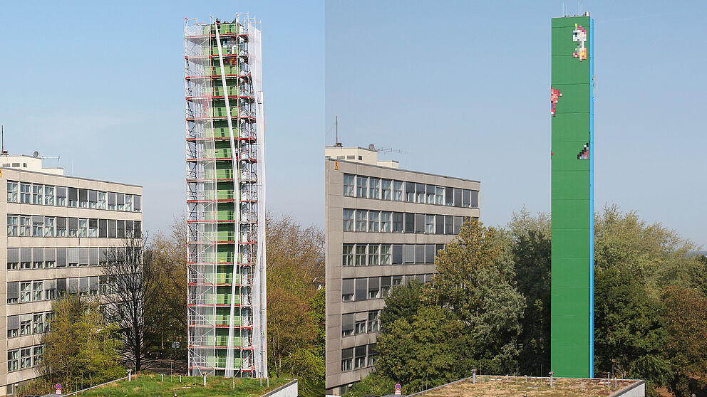 Foto (Universität Paderborn, Kamil Glabica): Links: Der Schornstein zu Beginn der Sanierungsarbeiten im April. Rechts: Nach Abschluss der Sanierungsarbeiten.