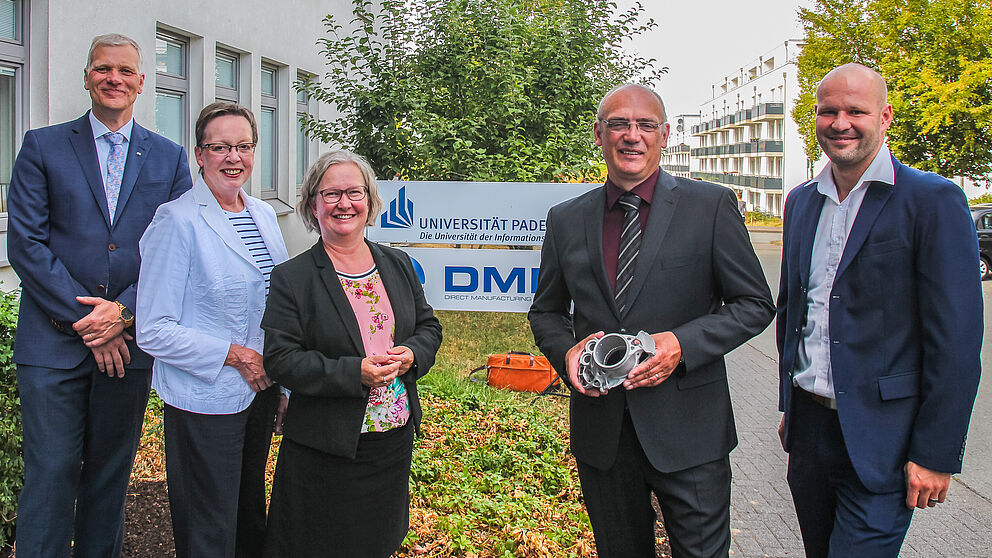 Foto (Universität Paderborn, Kamil Glabica): Freuen sich über die Förderung eines neuen Projekts zu additiver Fertigung (v. l.): Prof. Dr.-Ing. Volker Schöppner (Leiter der Arbeitsgruppe für Kunst-stoffverarbeitung), Marianne Thomann-Stahl (Regierungspräsidentin des Regierungsbezirks Detmold), Simone Probst (Vizepräsidentin für Wirtschafts- und Personalplanung der Universität Paderborn), Prof. Dr.-Ing. Mirko Schaper (Leiter der Arbeitsgruppe für Werkstoffkunde) und Dr.-Ing. Christian-Friedrich Lindemann (Geschäftsführer des DMRC).