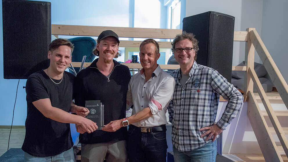 Foto (Julius Erdmann): (v. l.) Jörn Achtelik, Maximilian Erdmann und Joachim Magiera von der Syqlo GmbH wurden von Prof. Dr. Rüdiger Kabst mit dem Qualitätslabel der Universität Paderborn ausgezeichnet.