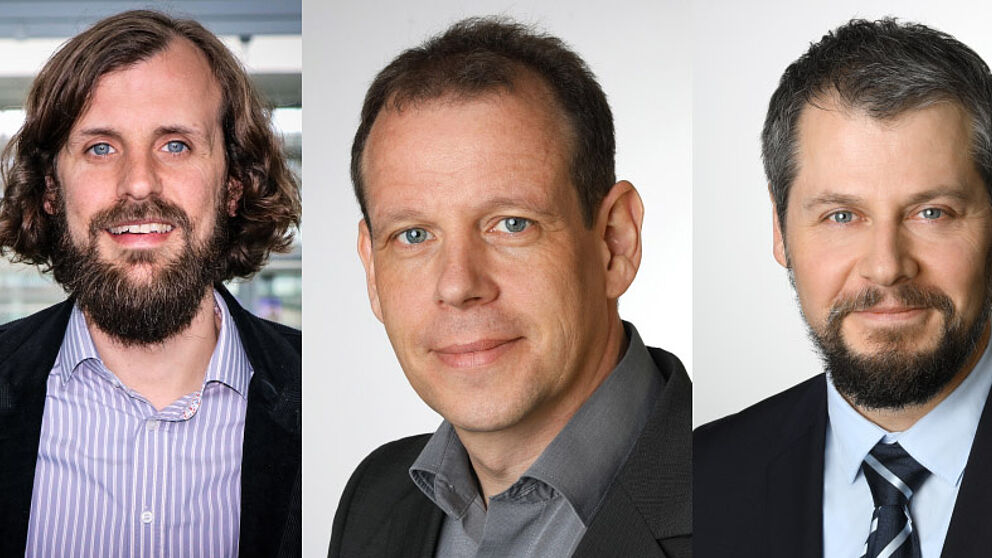 Foto (Universität Paderborn): Halten am 16. Oktober ihre gemeinsame Antrittsvorlesung an der Universität Paderborn: V. l.: Prof. Dr. Oliver Müller, Prof. Dr. Guido Schryen und Prof. Dr. Matthias Trier.