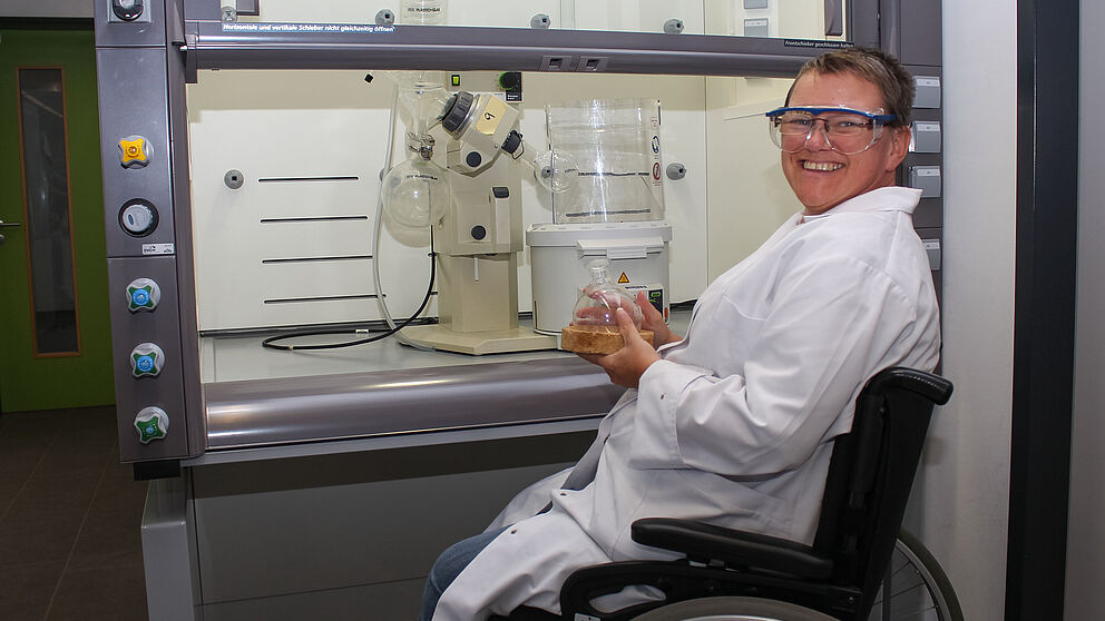 Foto (Universität Paderborn, Simon Ratmann): Heike Mulka, technische Mitarbeiterin am Lehrstuhl der Allgemeinen und Anorganischen Chemie, freut sich über den umgebauten Abzug im Chemielabor, der jetzt höhenverstellbar ist.