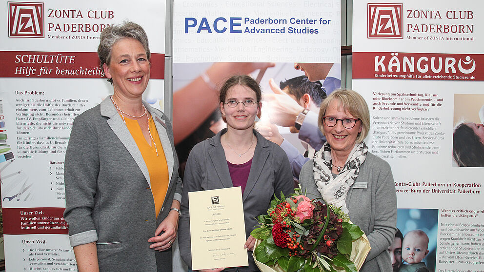 Foto (Universität Paderborn, Kamil Glabica): Petra Lettermann (links), Präsidentin des ZONTA Clubs Paderborn, und Bärbel Meerkötter (rechts) überreichen Dr. Marie-Christine Jakobs den ZONTA Wissenschaftspreis.