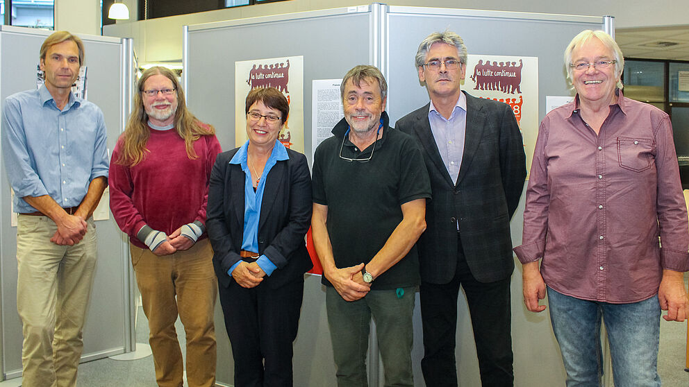 Foto (Universität Paderborn, Simon Ratmann): Freuen sich über eine neue Ausstellung in der Unibibliothek: V. l. Prof. Dr. Peter Fäßler (Historisches Institut der Uni Paderborn), Dr. Thomas Schroedter (Fach Soziologie), Prof. Dr. Birgitt Riegraf (Präsidentin der Uni Paderborn), Dr. John Matina (Fach Soziologie), Dr. Dietmar Haubfleisch (Leitender Bibliotheksdirektor) und Manfred Claes-Schaefers (Künstler und Grafiker).