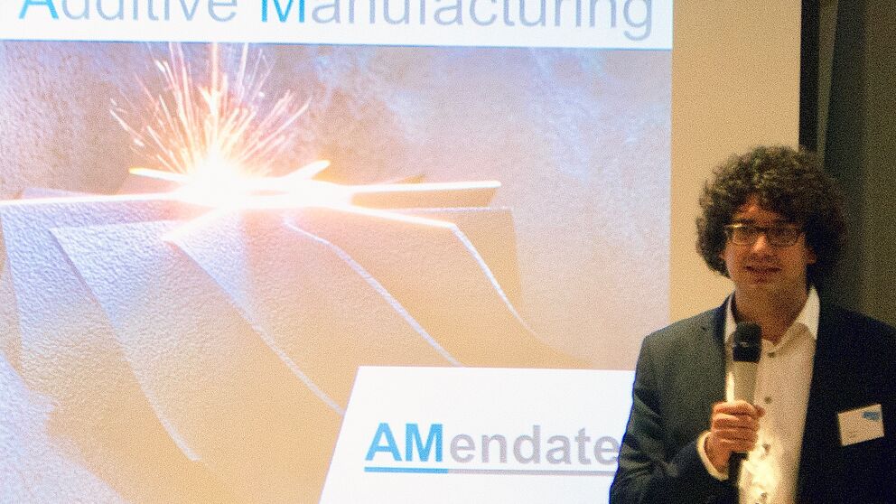 Foto (Universität Paderborn): Thomas Reiher, Gründer und Geschäftsführer von AMendate, stellte neben weiteren Gründern sein Unternehmen beim „OWL Start-up Pitch“ in der garage33 vor.