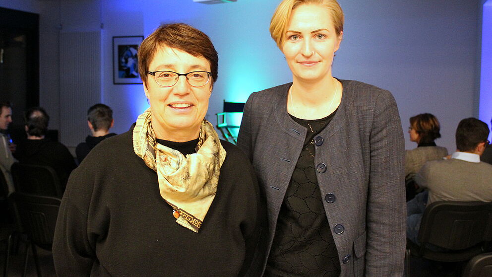 Foto (Universität Paderborn, Ricarda Michels): Diskutierten im AStA-Stadtcampus über Hass im Inter-net: V. l. Prof. Dr. Birgitt Riegraf, Präsidentin der Universität Paderborn, und Dr. Anna-Katharina Meßmer.
