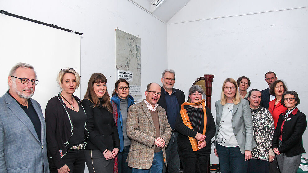 Foto (Universität Paderborn): Bei der Präsentation im Kunst-Silo der Universität Paderborn beleuchteten die Wissenschaftler den Wandmalereizyklus aus verschiedenen Blickwinkeln. Ulrike Heinrichs (sechste von rechts) freut sich als Projektleiterin über die enge Kooperation mit den beteiligten Forschern und Einrichtungen.