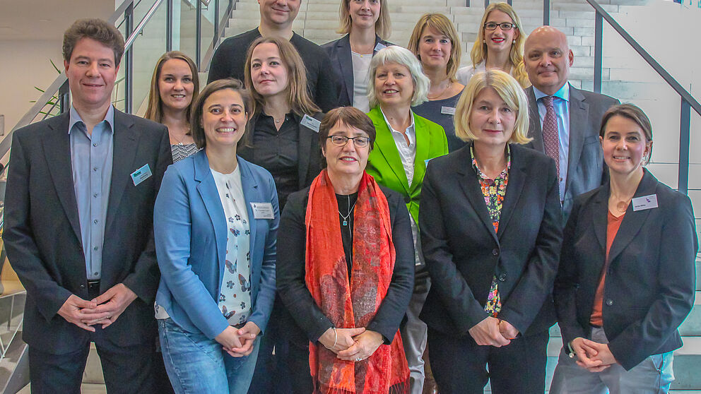 Foto (Universität Paderborn, Kamil Glabica): Ziehen eine positive Projektzwischenbilanz: Erste Reihe v. l. Dr. Bernt-Michael Hellberg (Career Service der Uni Bielefeld), Dr. Yvonne Koch (Zentrale Studienberatung der Uni Paderborn), Prof. Dr. Birgitt Riegraf (Präsidentin der Uni Paderborn), Prof. Dr. Ingeborg Schramm-Wölk (Präsidentin der FH Bielefeld), Ulrike Rehm (Zentrale Studienberatung der FH Bielefeld), zweite Reihe v. l. Christina Schapler (Zentrale Studienberatung der Uni Bielefeld), Lisa Hebermehl (Career Service der Uni Bielefeld), Dr. Marita Ripke (Zentrale Studienberatung der FH Bielefeld), Dr. Rolf Angermund (Ministerium für Kultur und Wissenschaft NRW), dritte Reihe v. l. Jan-Martin Müller (Zentrale Studienberatung der Uni Paderborn), Carolin Striewisch (Zentrale Studienberatung der FH Bielefeld), Hanna Lohau (Zentrale Studienberatung der Hochschule OWL) und Anja Kausch (Zentrale Studienberatung der Uni Paderborn).
