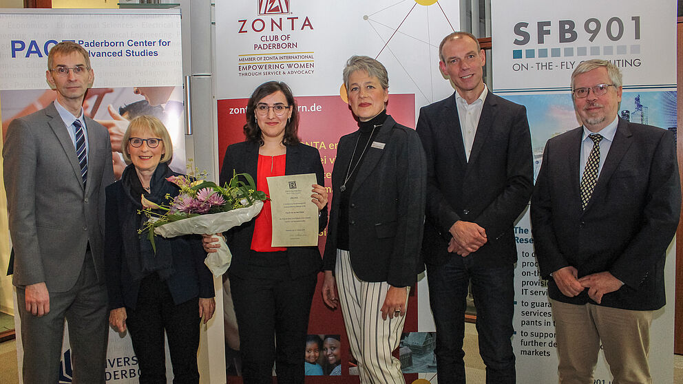 Foto (Universität Paderborn, Simon Ratmann): Gemeinsame Freude: v. l. Prof. Dr. Holger Karl, Bärbel Meerkötter, Preisträgerin Dr. Sevil Dräxler, Petra Let-termann (Präsidentin des Zonta-Clubs Paderborn), Prof. Dr. Johannes Blömer und Prof. Dr. Friedhelm Meyer auf der Heide.