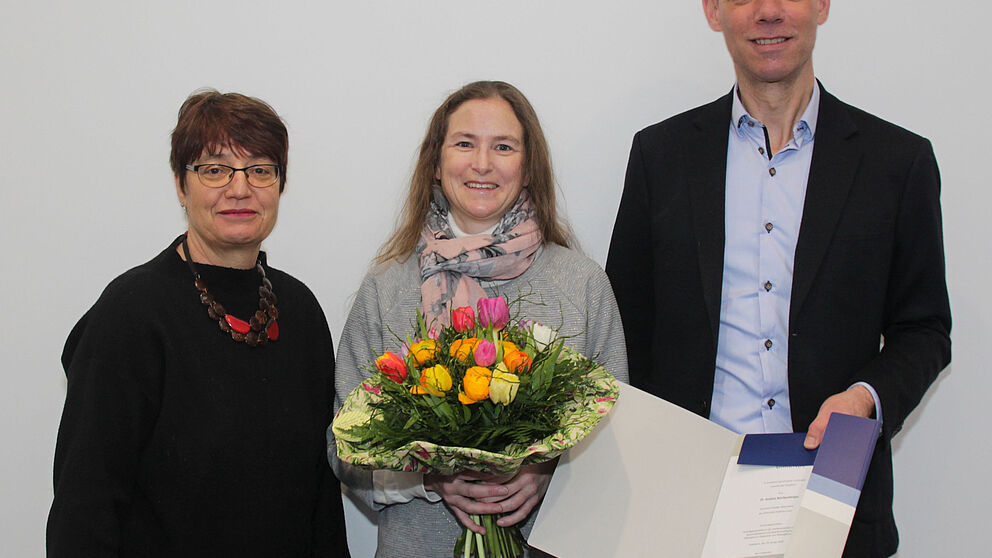 Foto (Universität Paderborn, Jennifer Strube): Prof. Dr. Birgitt Riegraf (l.) und Prof. Dr. Johannes Blömer gratulieren Dr. Andrea Reichenberger zu ihrem Stipendium.