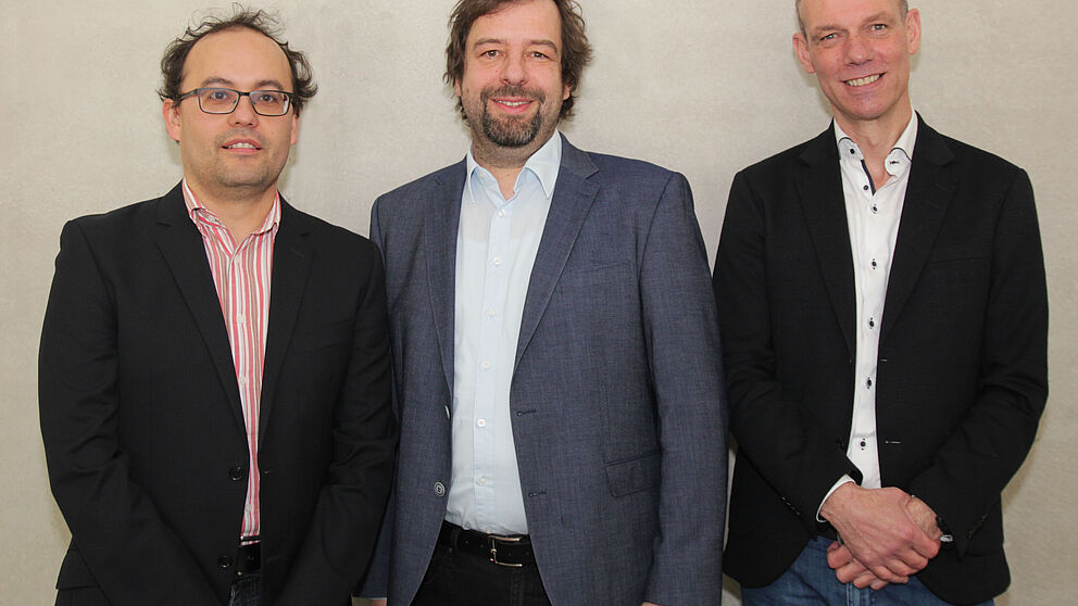 Foto (Universität Paderborn): Dr. Stefan Greil (Mitte) zusammen mit Prof. Dr. Caren Sureth-Sloane (rechts), Sprecherin des TRR 266, und Prof. Dr. Michael Ebert (links), Teilprojektleiter im TRR 266.