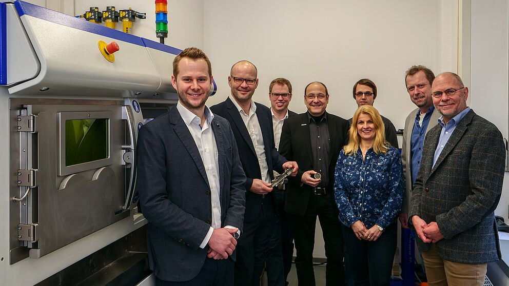 Foto (Universität Paderborn, Johannes Pauly): v. l.: Tobias Lieneke (Wissenschaftlicher Mitarbeiter, KAt/DMRC), Dr.-Ing. Christian-Friedrich Lindemann (Geschäftsführer, DMRC), Thomas Künneke (Wissenschaftlicher Mitarbeiter, KAt/DMRC), Klaus Watermeier, Marius Bröker (beide Dezernat 5.1 Bauangelegenheiten), Diana Riedel und Martin Hohrath (beide Dezernat 5.3 Arbeits-, Gesundheits- und Umweltschutz) sowie Prof. Dr.-Ing. Detmar Zimmer (Lehrstuhlleiter, KAt).