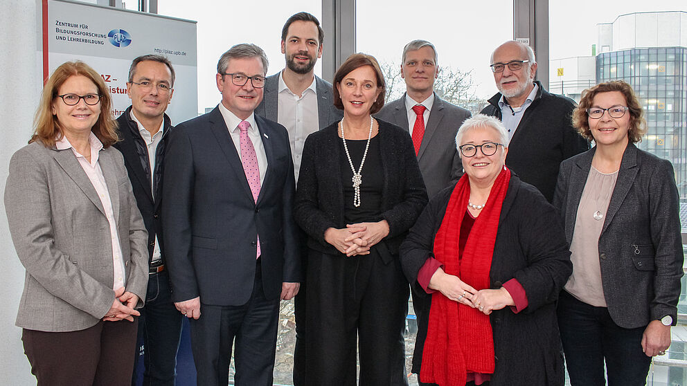 Foto (Universität Paderborn, Simon Ratmann): Erste Reihe v. l. Prof. Dr. Dorothee Meister (Universität Paderborn), Michael Dreier (Bürgermeister Stadt Paderborn), Yvonne Gebauer (Ministerin für Schule und Bildung des Landes NRW), Sigrid Beer (Sprecherin für Bildung, Petitionen und Religionspolitik der Fraktion Bündnis 90/Die Grünen im Landtag von NRW) und Jun.-Prof. Dr. Anna-Maria Kamin (Universität Bielefeld). Zweite Reihe v. l.: Prof. Dr. Bardo Herzig (Direktor des Zentrums für Bildungsforschung und Lehrerbildung – PLAZ-Professional School der Universität Paderborn), Marc Lürbke (stellvertretender Fraktionsvorsitzender der FDP im Landtag von NRW), Prof. Dr.-Ing. Volker Schöppner (Vizepräsident für Lehre, Studium und Qualitätsmanagement der Universität Paderborn) und Detlef Schubert (Bezirksregierung Detmold).