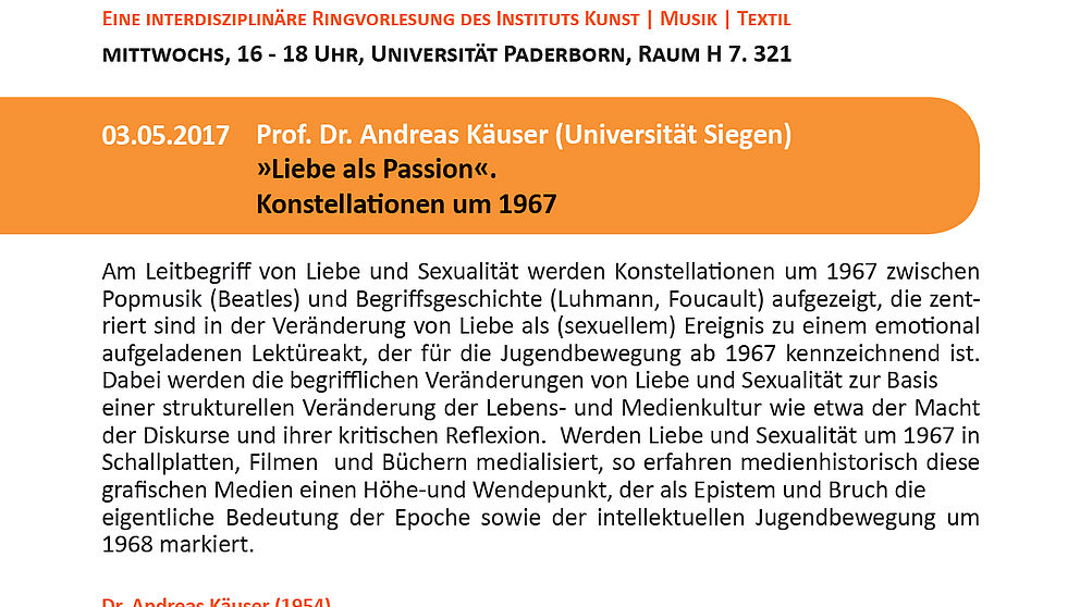 Am Mittwoch, 3. Mai, hält Dr. Andreas Käuser (Universität Siegen) im Rahmen der Ringvorlesung „Kunst[be]griffe 5“ einen Vortrag über „Liebe als Passion“. Die Veranstaltung beginnt um 16 Uhr im Raum H7.321 der Universität. Die interessierte Öffentlichkeit ist herzlich eingeladen.