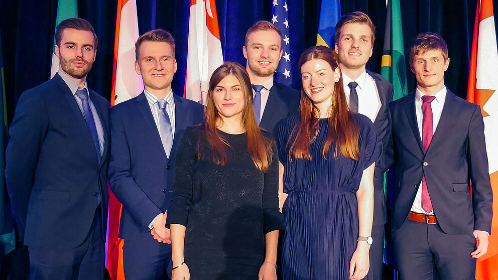 Foto (Universität Paderborn): Vertraten die Universität Paderborn beim internationalen Fallstudienwettbewerb in Montreal: V. l. Rico Heuchel, Matthias Balkenhol, Jessica Linneweber, Julian Bürger und Sarah-Marie Kuhlmann mit Coach Lucas Pieper und Jun.-Prof. Dr. Matthias Pelster.