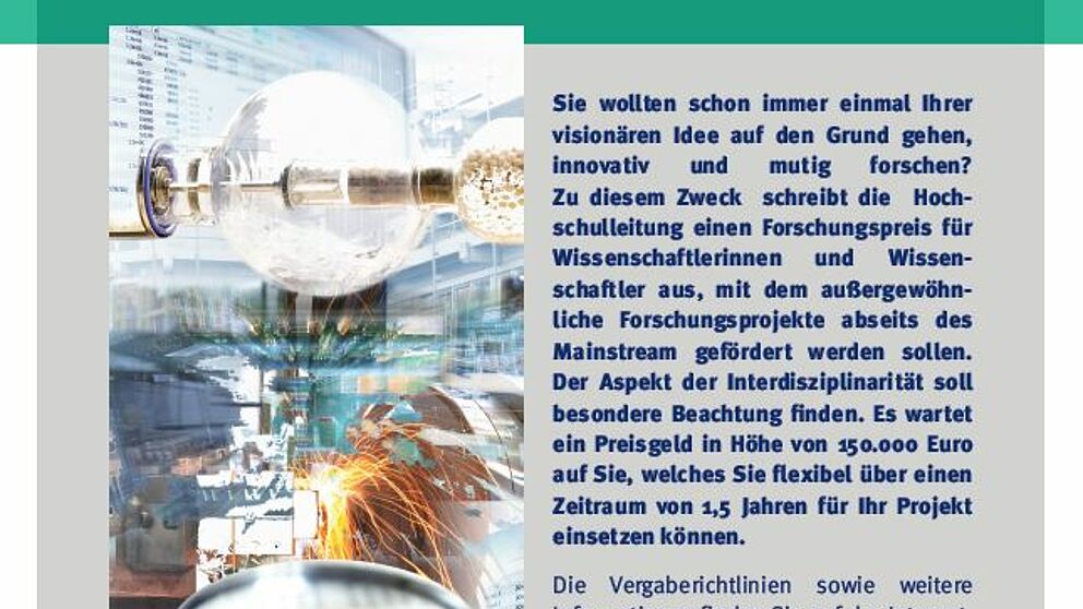 Die Hochschulleitung schreibt einen Forschungspreis für Wissenschaftlerinnen und Wissenschaftler aus, mit dem außergewöhnliche Forschungsprojekte abseits des Mainstream gefördert werden sollen.