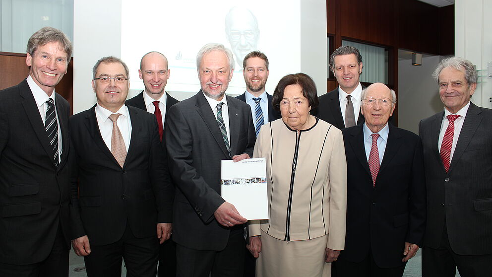 Foto (Universität Paderborn, Frauke Döll): Feierstunde zur Übergabe der neuen Broschüre mit (v. l.): Prof. Dr. Nikolaus Risch (Uni-Präsident a. D.), Prof. Dr.-Ing. Christoph Scheytt (neuer Vorsitzender des Heinz Nixdorf Instituts), Prof. Dr. Falko Dressler (neuer Lehrstuhlinhaber „Distributed Embedded Systems“), Prof. Dr. Wilhelm Schäfer (Präsident Universität Paderborn), Prof. Dr. Eric Bodden (neuer Lehrstuhlinhaber „Software Engineering“), Renate und Martin Nixdorf, Dr. Horst Nasko sowie Dr. Bernd Klein (beide Vorstandsmitglieder der Heinz Nixdorf Stiftungen).
