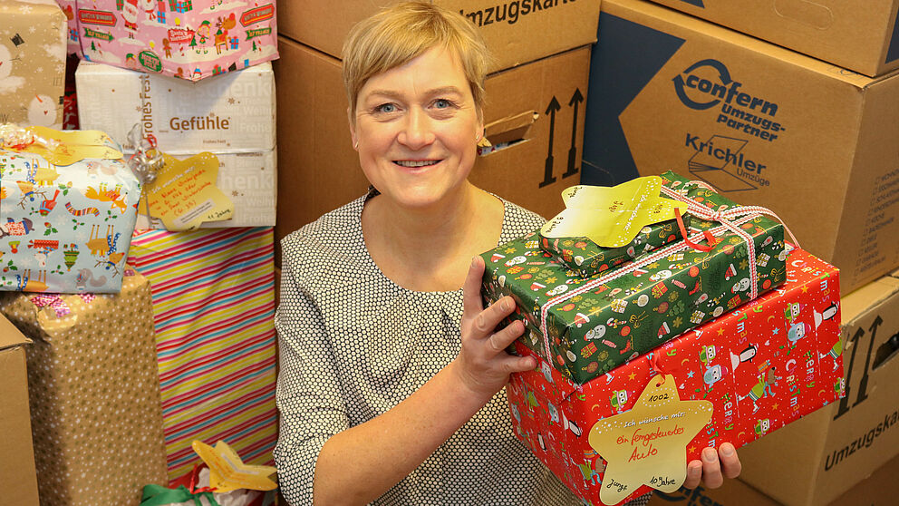 Foto (Universität Paderborn, Melissa Kaffka): In diesem Jahr erfüllten Studierende und Mitarbeitende sensationelle 430 Wünsche für bedürftige Kinder. Alexandra Dickhoff, Geschäftsführerin von Alumni Paderborn, sagt Danke.