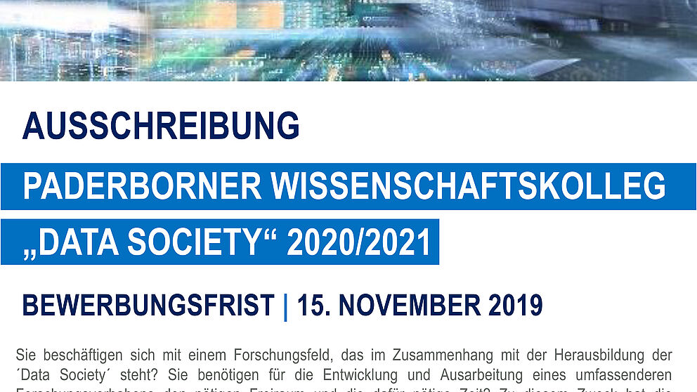 Sie beschäftigen sich mit einem Forschungsfeld, das im Zusammenhang mit der Herausbildung der „Data Society“ steht? Sie benötigen für die Entwicklung und Ausarbeitung eines umfassenderen Forschungsvorhabens den nötigen Freiraum und die dafür nötige Zeit? Zu diesem Zweck hat die Universitätsleitung das Paderborner Wissenschaftskolleg „Data Society“ initiiert.