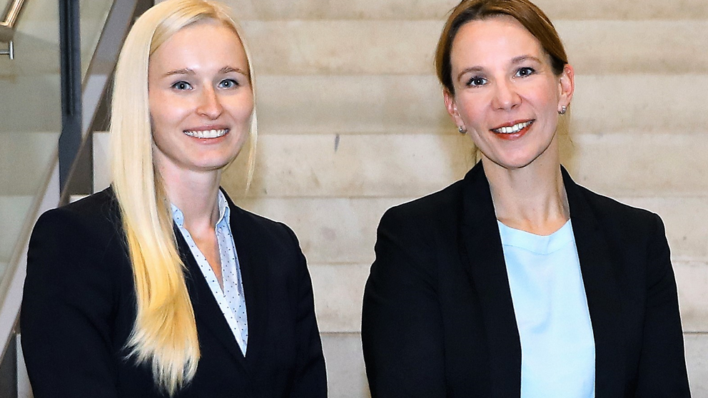 Foto (Universität Paderborn): V. l.: Für den Einsatz von Robotern in der Pflege erforschen Julia Hoppe und Prof. Dr. Kirsten Thommes im Projekt „ORIENT“ die Bedürfnisse von Fachkräften, Patienten und Angehörigen.