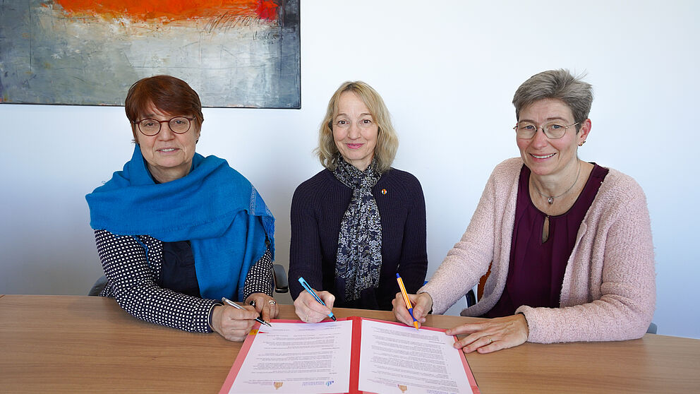 Foto (Universität Paderborn, Felix Thielemann): v.l. Universitätspräsidentin Prof. Dr. Birgitt Riegraf, Prof. Dr. Sabine Schmitz (BELZ) und Nicole Michaelis (Schulleiterin am Gymnasium Theodorianum) unterzeichnen die Kooperationsvereinbarung „Benelux macht Schule“.