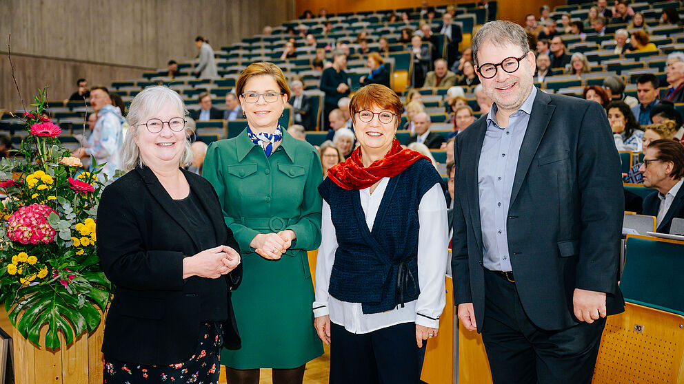 Foto (Universität Paderborn, Besim Mazhiqi): (v. l.) (v. l.) Simone Probst, Vizepräsidentin für Wirtschafts- und Personalverwaltung, Prof. Dr. Bettina Kohlrausch, Festrednerin und Vorsitzende der Hans-Böckler-Stiftung, Prof. Dr. Birgitt Riegraf, Präsidentin der Universität Paderborn, und Moderator Ulrich Lettermann beim Neujahrempfang 2025 der Universität Paderborn.