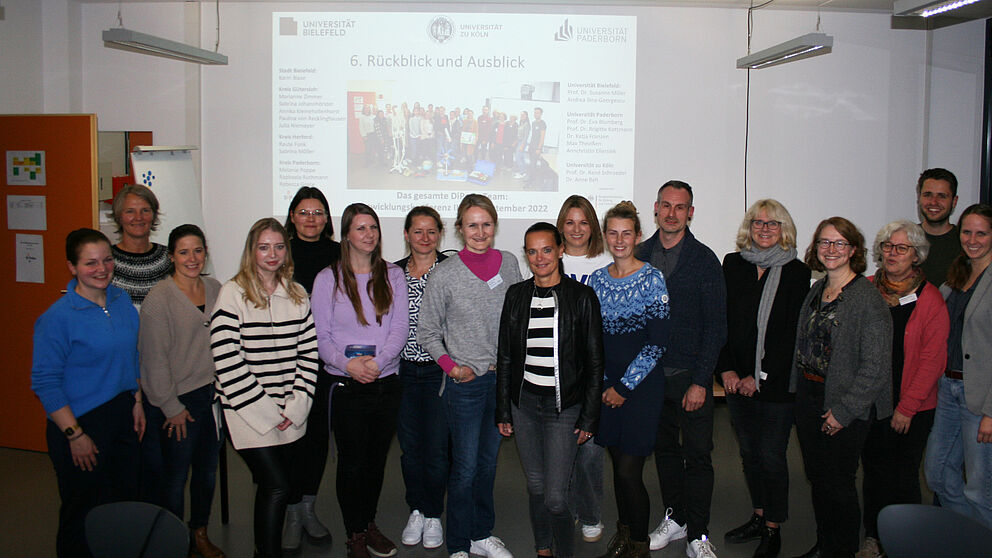 Foto (AG Blumberg, Universität Paderborn): Die im DiPoSa-Projekt beteiligten Wissenschaftler*innen und Sachunterrichtslehrkräfte aus OWL freuen sich bei ihrer letzten Entwicklungskonferenz an der Universität Paderborn über den erfolgreichen Verlauf und Abschluss des DiPoSa-Projekts.