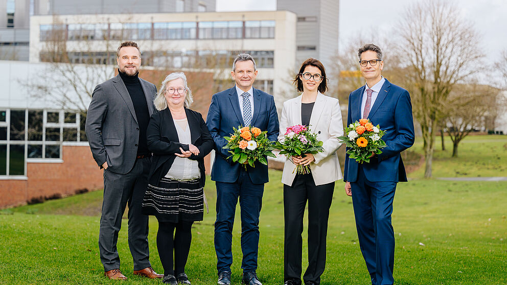 Foto (Universität Paderborn, Besim Mazhiqi): Ab April 2025 als Präsidium der Universität Paderborn im Amt: (v.l.n.r.) Prof. Dr. Matthias Bauer, Simone Probst, Prof. Dr. Thomas Tröster, Prof. Dr. Beate Flath und Prof. Dr. René Fahr. Auf dem Bild fehlt Prof. Dr. Heike Trautmann.