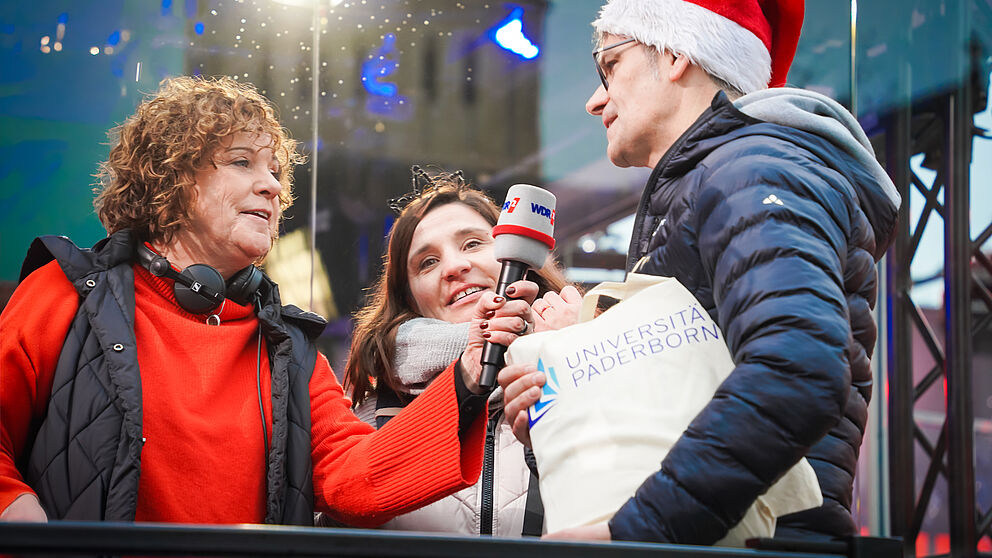 Foto (Universität Paderborn, Johanna Pietsch): Prof. Dr. René Fahr (rechts) überreichte dem WDR 2-Team die in der „Weihnachtswunderwoche“ gesammelten Spenden der Universität Paderborn.