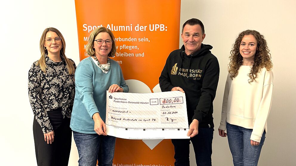 Ende vergangenen Jahres sind über 200 Alumni des Departments Sport und Gesundheit der Universität Paderborn zum Ehemaligen-Treffen zurück auf den Campus gekommen. Den Überschuss der abendlichen Abschlussparty in Höhe von 800 Euro haben die Organisator*innen nun an das Paderborner Netzwerk „Kinderschutz im Sport“ übergeben.