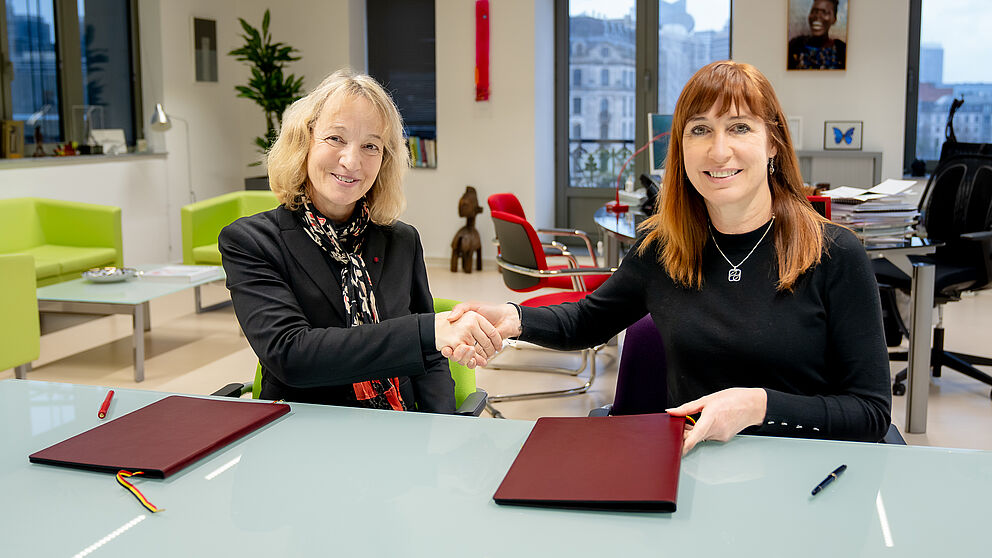Foto (J. Van Belle – WBI): (v. l.) Prof. Dr. Sabine Schmitz, erste Vorsitzende des Paderborner BELZ, Pascale Delcomminette, Leiterin des WBI, bei der Vertragsunterzeichnung in Brüssel.