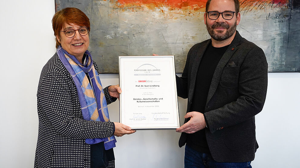 Foto (Universität Paderborn, Selina Härtel): Prof. Dr. Sven Lindberg ist als Zweitplatzierter in der Kategorie Geistes-, Gesellschafts- und Kulturwissenschaften aus dem Wettbewerb „Professor des Jahres“ hervorgegangen. Uni-Präsidentin Prof. Dr. Birgitt Riegraf gratuliert bei der Urkundenübergabe.