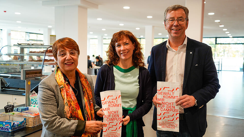 Foto (Universität Paderborn, Leonie Mayer): (v. l.) Universitätspräsidentin Prof. Dr. Birgitt Riegraf, Dr. Annika Hegemann, zentrale Gleichstellungsbeauftragte der Universität Paderborn, und Ulrich Schmidt, Geschäftsführer vom Studierendenwerk, setzen gemeinsam ein Zeichen gegen Gewalt an Frauen.